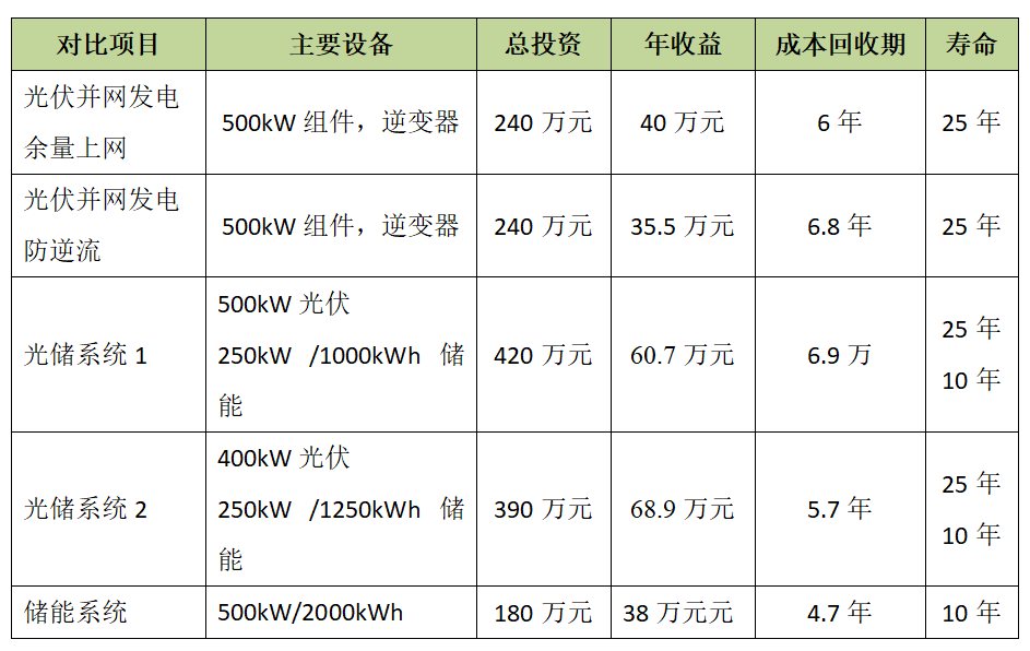 我國已宣布2030年前實現(xiàn)碳達峰、2060年實現(xiàn)碳中和。2030年非化石能源消費比重將達到25%。為確保完成這一政策目標,綠色能源成為主體電源,2030年風電光伏裝機規(guī)模超過國家承諾的12億千瓦下限已是共識。這意味著,高比例新能源應(yīng)用已經(jīng)成為我國電能輸送、配用、消納的主要場景,而儲能是實現(xiàn)并保障高比例電力系統(tǒng)安全、穩(wěn)定、可靠和高效的強力支撐。從應(yīng)對氣候挑戰(zhàn)的戰(zhàn)略層面看,儲能是支撐“3060”大目標的關(guān)鍵技術(shù),它不止是實現(xiàn)并保障高比例新能源在電力系統(tǒng)的應(yīng)用,對整個電力系統(tǒng)能量平衡和功率平衡以及建設(shè)電力冗余,進而提高系統(tǒng)效率、降低用電成本具有“革命性”的貢獻。 安裝光伏和風電發(fā)電,可以直接減排,是實現(xiàn)碳達峰和碳中和的主力軍,而安裝儲能,可以提高光伏和風電在電網(wǎng)的比例,減少棄風棄光比例,可以間接減排,目前光伏系統(tǒng)和儲能系統(tǒng)成本較低,并且在持續(xù)下降,投資光伏既有利益,又可響應(yīng)國家號召,為環(huán)保做一份貢獻。 下面分析,光伏、光儲以及用戶側(cè)儲能三個項目的特點,投資經(jīng)濟性對比。 例以深圳某工業(yè)廠房為例,該地區(qū)高峰時段電價1.0249元/度(9:00—11:30、14:00—16:30、19:00—21:00),平時段電價0.6724元/度(7:00—9:00、11:30—14:00、16:30—19:00、21:00—23:00),低谷時段電價 0.2284元/度(23:00—次日7:00),該工廠平均負載功率為800kVA,工廠是早上8點開工,下午18點收工。一年工作時間為280天左右。以下模式設(shè)定為廠房業(yè)主有閑余資金自投,光伏發(fā)電或者儲能用于抵消電費開支,沒有計算資金的貨款成本,以及稅金和租金等各種開支。 光伏并網(wǎng)發(fā)電 特點:光伏并網(wǎng)系統(tǒng),負載優(yōu)先使用太陽能,當負載用不完后,多余的電送入電網(wǎng),當光伏電量不足時,電網(wǎng)和光伏可以同時給負載供電,光伏發(fā)電依賴于電網(wǎng)和陽光,當電網(wǎng)斷電時,逆變器啟動孤島保護功能,太陽能不能發(fā)電,負載也不能工作;系統(tǒng)輸出功率和光照同步,和電網(wǎng)峰平谷電價沒有關(guān)系。 根據(jù)該公司屋頂可裝光伏和面積,負載用電負載功率和用電情況,安裝一個500kW的光伏電站,開工期間光伏用電可以全部自用,正常工作日8點之前和18點之后和休息日余量上網(wǎng),以脫硫電價0.453元賣給電網(wǎng)公司,經(jīng)過綜合計算,自發(fā)自用比例為80%,余電上網(wǎng)比例為20%。 按照2021年的光伏電站安裝行情,整個系統(tǒng)初裝費用為240萬元。500kW在深圳地區(qū),平均每年發(fā)電50萬度,峰段占比最大,約為24萬度,按1.025元每度價格算,每年收益約為24.6萬元,平段約為16萬度,按0.6724元每度價格算,每年收益為10.8萬元,余量上網(wǎng)比例為20%為10萬度,以脫硫電價0.453元賣給電網(wǎng)公司,總收入為4.5萬元,加起來約為40萬元,大約6年收加投資。 光伏儲能系統(tǒng) 相對于并網(wǎng)發(fā)電系統(tǒng),光儲系統(tǒng)增加了充放電控制器和蓄電池,系統(tǒng)成本增加了30%左右,但是應(yīng)用范圍更寬。一是可以設(shè)定在電價峰值時以額定功率輸出,減少電費開支;二是可以電價谷段充電,峰段放電,利用峰谷差價賺錢;三是當電網(wǎng)停電時,光伏系統(tǒng)作為備用電源繼續(xù)工作,逆變器可以切換為離網(wǎng)工作模式,光伏和蓄電池可以通過逆變器給負載供電。上述的項目,在光伏電站增加一個儲能系統(tǒng),光伏繼續(xù)安裝500kW,設(shè)計一套250kW儲能系統(tǒng),配備一臺250kW的PCS雙向儲能變流器,1000kWh儲能鋰電池,整個光儲系統(tǒng)初裝費用為420萬元,光伏平均每年發(fā)電50萬度,由于安裝儲能,可以調(diào)節(jié)光伏電量輸出時間,計劃安排30萬度在電價峰值時功率輸出,每年收益約為30.8萬元,10萬度為平段時間輸出,每年收益為6.7萬元,20%節(jié)假日以脫硫電價0.453元賣給電網(wǎng)公司,總收入為4.5萬元,利用峰谷0.8元每度的價差,每天充電800度,充放電效率算0.85,在高峰期放640度,一年約14.2萬元;電網(wǎng)停電會給工廠帶來較大的損失,停電一小時,可能損失幾千到幾萬元,加裝儲能系統(tǒng),可作為備用電源使用,一年估算4.5萬左右,每年收益60.7萬,大約6.9年收回投資。 上述的項目,根據(jù)負載平均功率和光伏峰值功率的容量差距,再改動一下,光伏減少為400kW,儲能改為250kW/1250kWh,整個光儲系統(tǒng)初裝費用為390萬元,光伏和儲能所有的電改為全部在電價高峰值放出,周末光伏的電除了自用之外儲能起來,只有長假期間才送到電網(wǎng),光伏平均每年發(fā)電40多萬度,有350天可以全部在電價高峰值放出,大約為38萬多度,每年收益約為39萬元,2萬度電以脫硫電價0.453元賣給電網(wǎng)公司,總收入為0.9萬元,利用峰谷0.8元每度的價差,每天充電1250度,充放電效率算0.85,在高峰期放1060度,一年收益約22.5萬元,夏天停電時,光儲可以工廠持續(xù)供電3-4小時,大大增加用電的可靠性,加上儲能還可改善功率因素,減少變壓器擴容費用,一年估計能增加6.5萬,每年收益68.9萬, 大約5.7年收回投資. 用戶側(cè)儲能系統(tǒng) 該系統(tǒng)主要設(shè)備是雙向儲能逆變器和蓄電池,電價谷時充電,電價峰時充電,電網(wǎng)停電時,作為后備電源使用。還是上述的項目,我們設(shè)計一臺500kW的PCS雙向儲能變